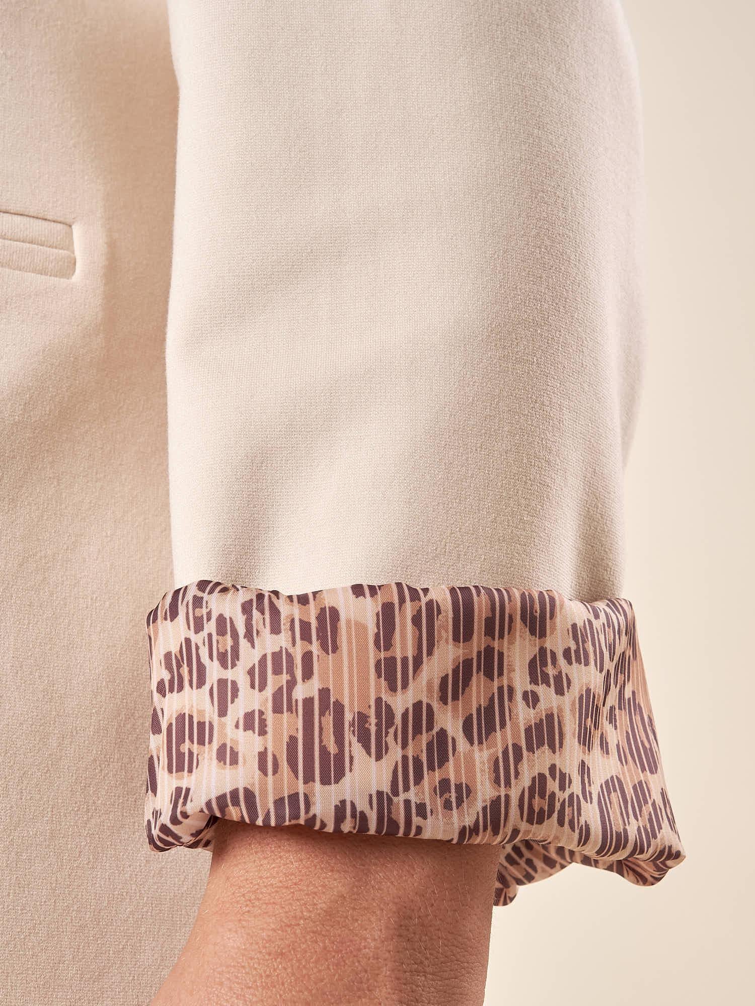 Fodera animalier a contrasto: dettaglio audace e glamour, visibile nei movimenti o con le maniche risvoltate.