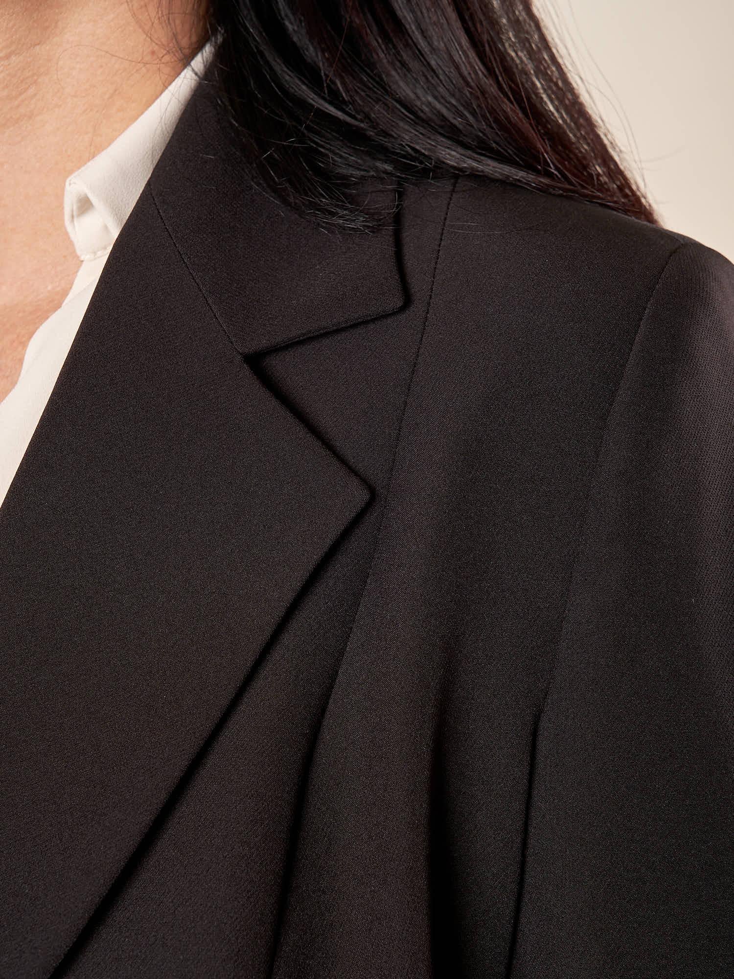 Il design pulito e minimal è pensato per adattarsi facilmente a ogni stile, diventando un must-have nel guardaroba curvy. Il monopetto dona un tocco classico e discreto, mentre il tessuto tecnico garantisce resistenza, comfort e una caduta impeccabile.