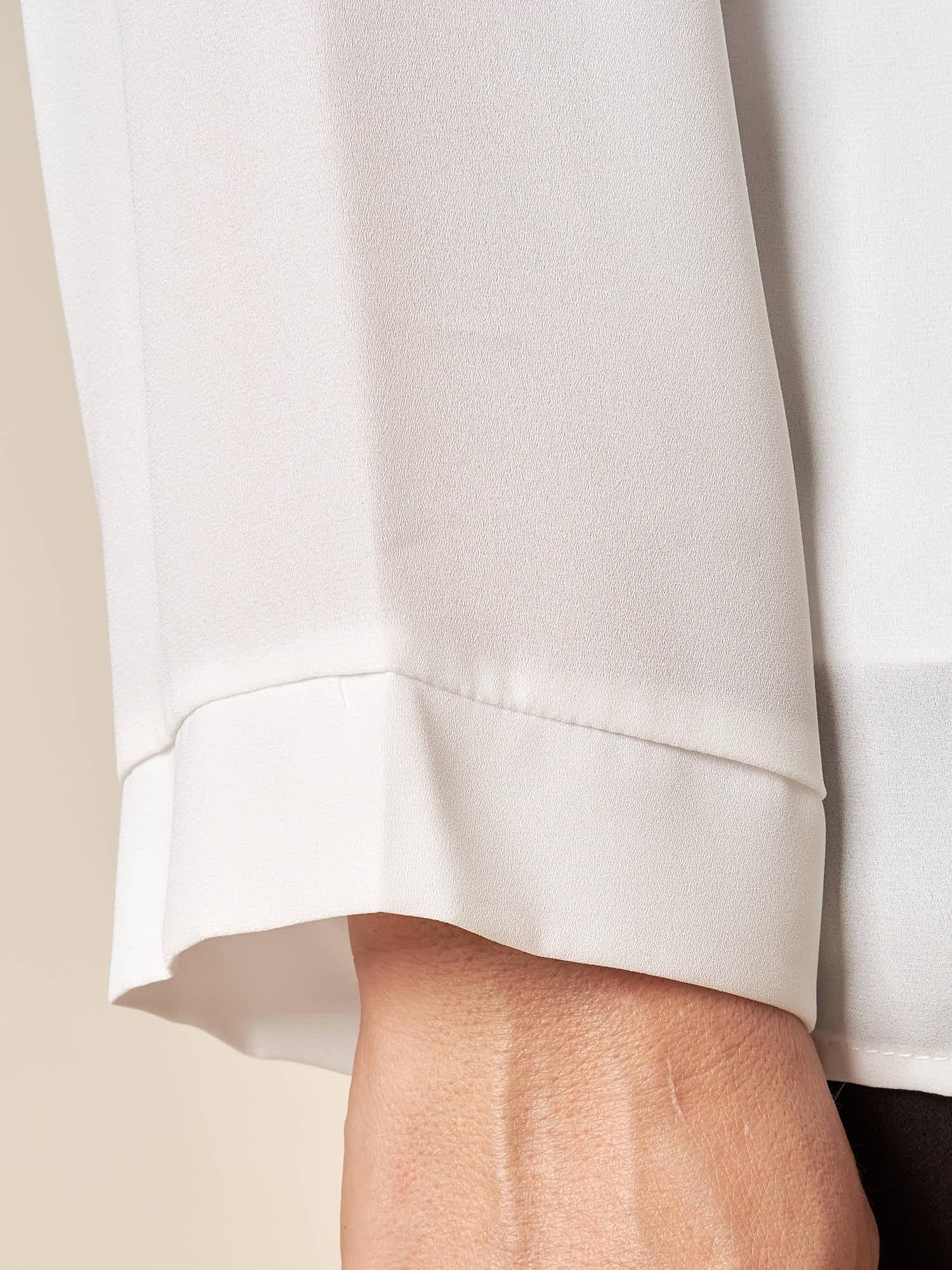 Le pience sul davanti garantiscono una vestibilità morbida e fluida, pensata per accompagnare le forme con naturalezza. Il polsino dritto senza bottoni completa il design con una linea pulita e contemporanea, ideale per chi ama uno stile curvy essenziale ma ricercato.