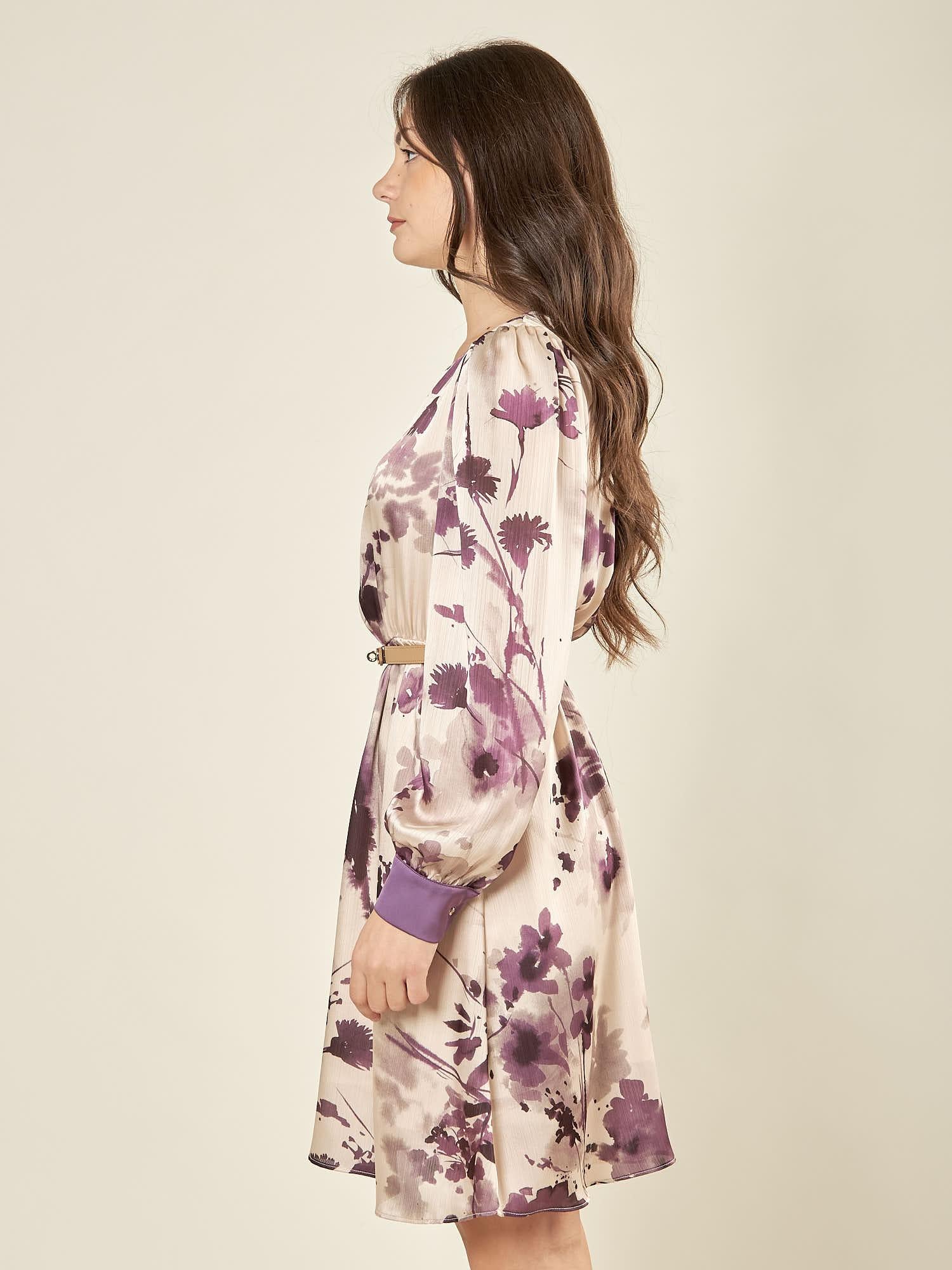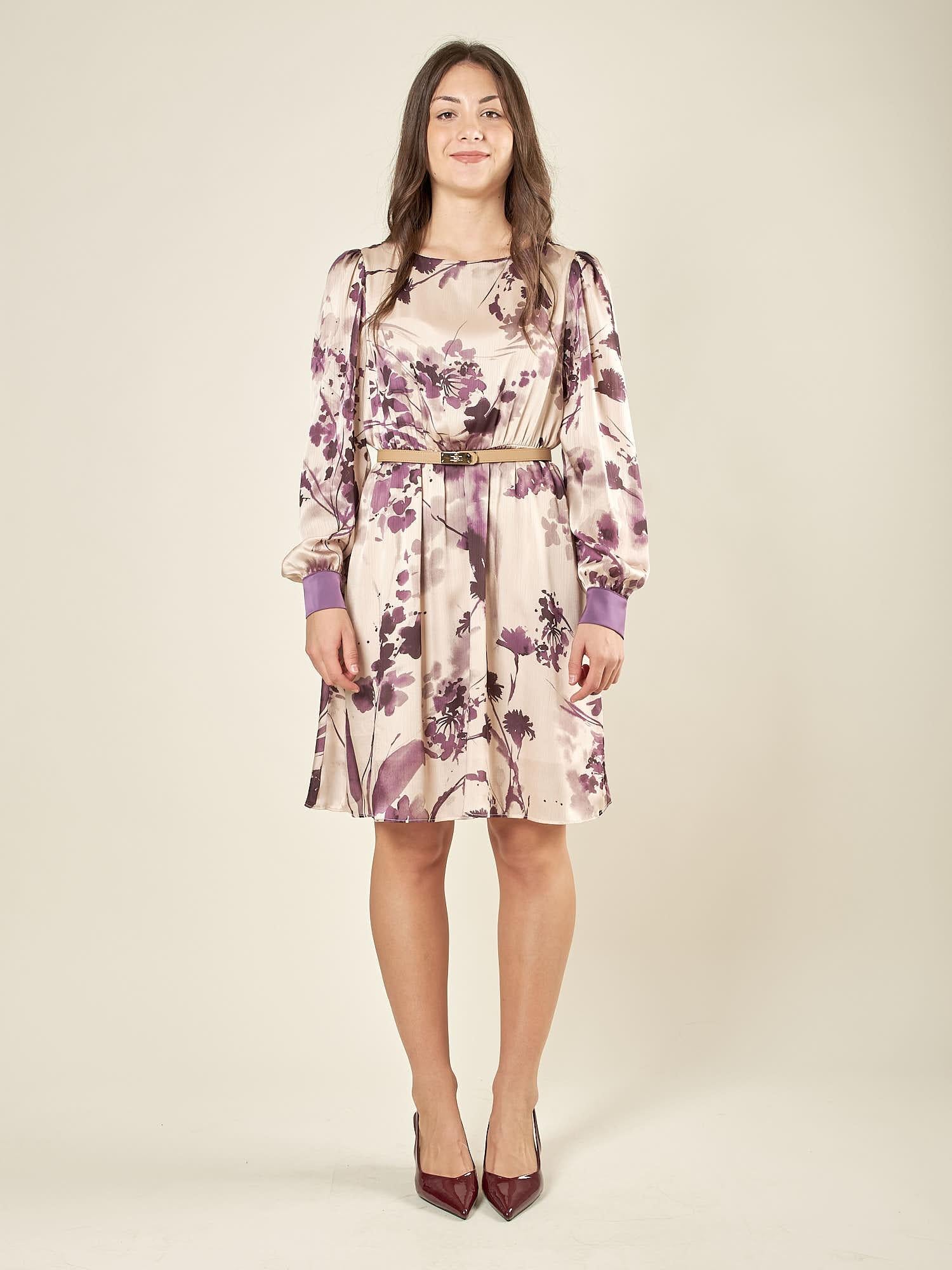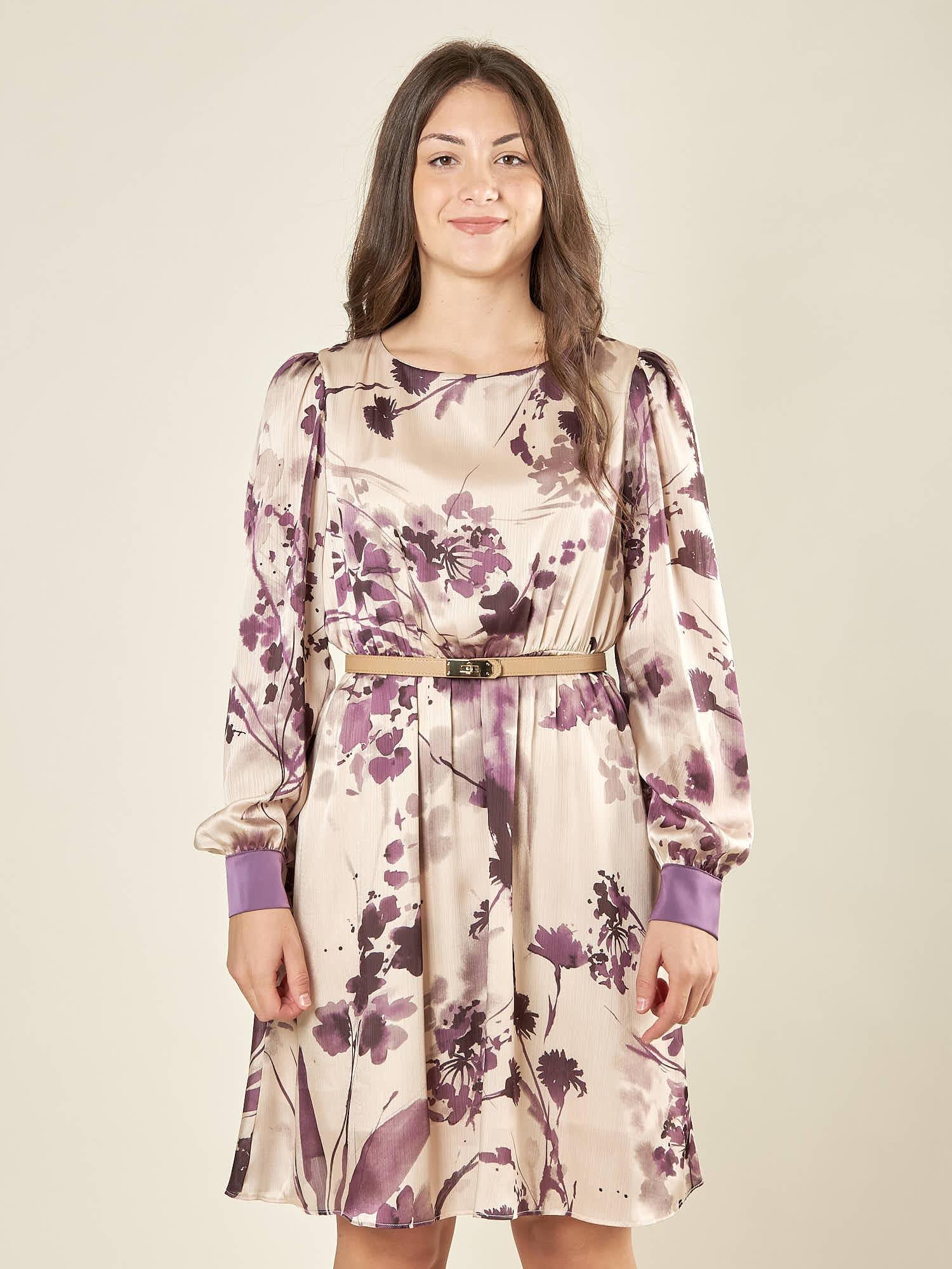 Abito donna corto in fantasia. Maniche lunghe, girocollo ed elastico in vita.