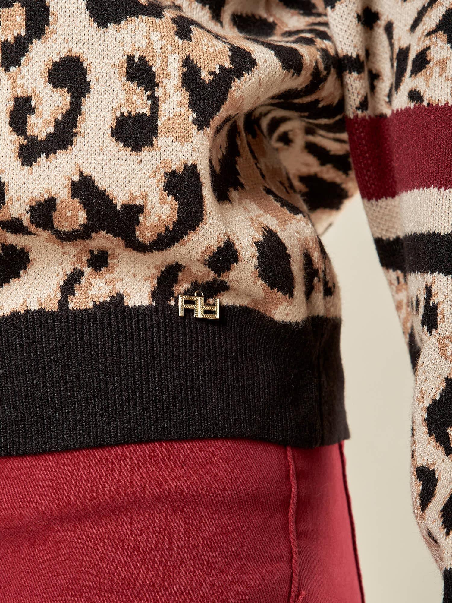 Elegante e moderna, questa maglia donna a maniche lunghe presenta una stampa animalier con contrasti in nero, avorio e bordeaux. Il girocollo classico e il tessuto caldo e confortevole la rendono perfetta per look quotidiani o più ricercati durante la stagione fredda.