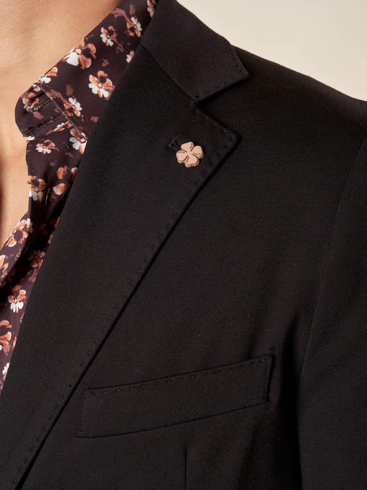 Le tasche a toppa aggiungono un tocco moderno e rilassato, mentre la chiusura a due bottoni valorizza la silhouette maschile con eleganza. Il tessuto punto Milano, noto per la sua struttura compatta e la mano morbida, dona alla giacca un aspetto sofisticato e una resistenza superiore all’usura.